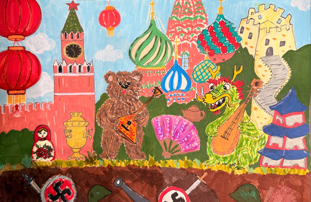На моем рисунке нарисованы медведь с балалайкой и дракон с китайским инструментом - пипой — это символы России и Китая. Я изобразила их вместе, чтобы показать, что наши страны дружат, хотя и говорят на разных языках. На заднем плане видны Кремль и Великая китайская стена, потому что это очень известные места в наших странах. Под цветущей землей и голубым мирным небом скрывается прошлое - разбитые знаки фашистской Германии и милитаристской Японии, потому что Россия и Китай боролись за мир вместе. Я добавила китайские фонарики, веер, русскую матрешку и самовар, чтобы картина получилась яркой и праздничной. Моя главная мысль: дружба помогает побеждать зло, и если мы вместе, мы можем сделать мир добрее и безопаснее для всех!!! Наша дружба на века!