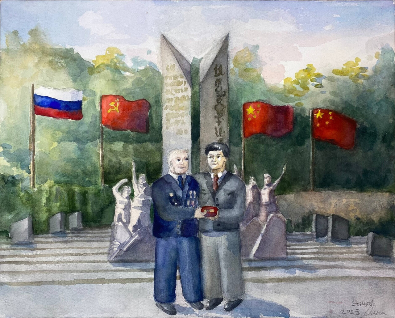Выбор сюжета для моего рисунка, на котором китайский президент награждает русского ветерана, не случаен и имеет глубокий смысл. Этот образ олицетворяет дружбу и солидарность двух стран в исторически значимых моментах, когда Россия и Китай вместе боролись против фашистских и милитаристских режимов. Прототипом ветерана стал 98-летний Владимир Лямин, который принимал участие в операции на северо-востоке Китая, что подчеркивает важность личных историй и памяти о тех, кто отстоял мир и свободу. Памятник летчикам-героям в Нанкине служит напоминанием о ценности сотрудничества в тяжелые времена. Выбор этого сюжета демонстрирует не только уважение к прошлому, но и силу единства, которое помогает строить мирное светлое будущее. Основная идея произведения состоит в том, что, вспоминая историю, мы закладываем основу для дальнейшего сотрудничества и мира, вдохновляя будущие поколения продолжать эту важную традицию.