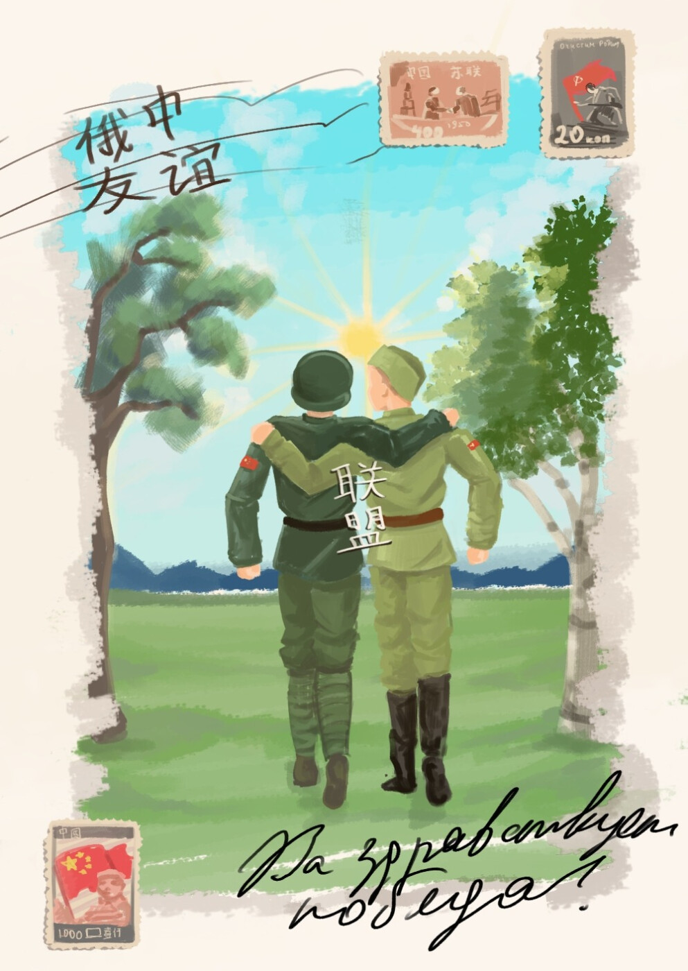 Открытка, посвященная дню Победы КНР и СССР над фашистскими и милитаристскими войсками. На переднем плане изображены два солдата из двух стран. Слева от них сосна, которая символизирует в Китае долголетие и бессмертие, показывая крепкую и долгую связь между Россией и КНР. Справа от солдат русская береза- символ чистоты и обновления. На заднем плане виднеется чистое небо и яркое солнце- начало новой жизни. В самом центре картины два иероглифа, означающих "союз". Главная идея картины- показать взаимопомощь и взаимовыручку двух стран во время Второй мировой войны.