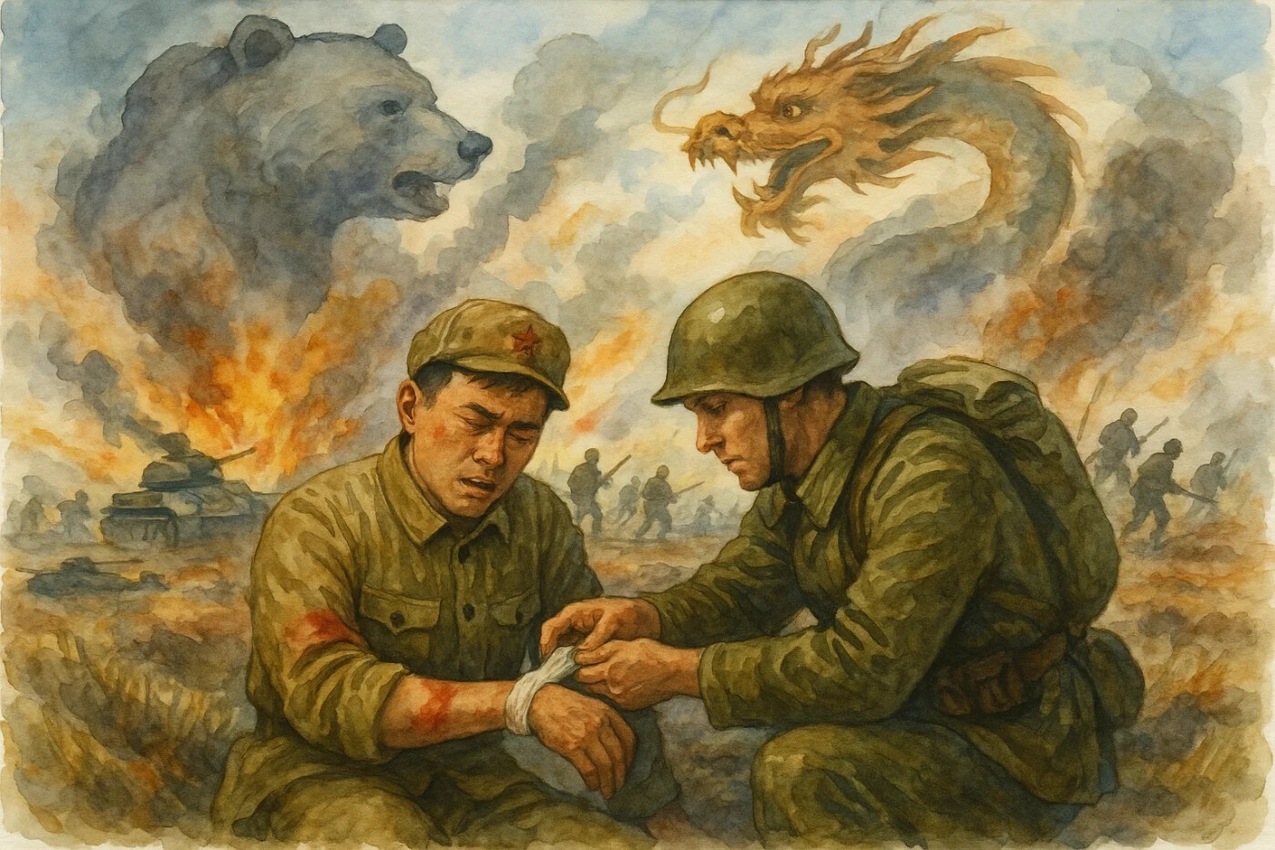 На картине изображено страшное поле боя, время войны с немецкими фашистами и японскими милитаристами. Советский военный, помогает раненому китайскому бойцу, обвязывая его окрававленную руку. Это показывает дружбу, помощь и поддержку наций в такое ужасное время. В небе дым от взрывов складывается в образы медведя и дракона. Они символизируют силу, мощь и характер России и Китая.