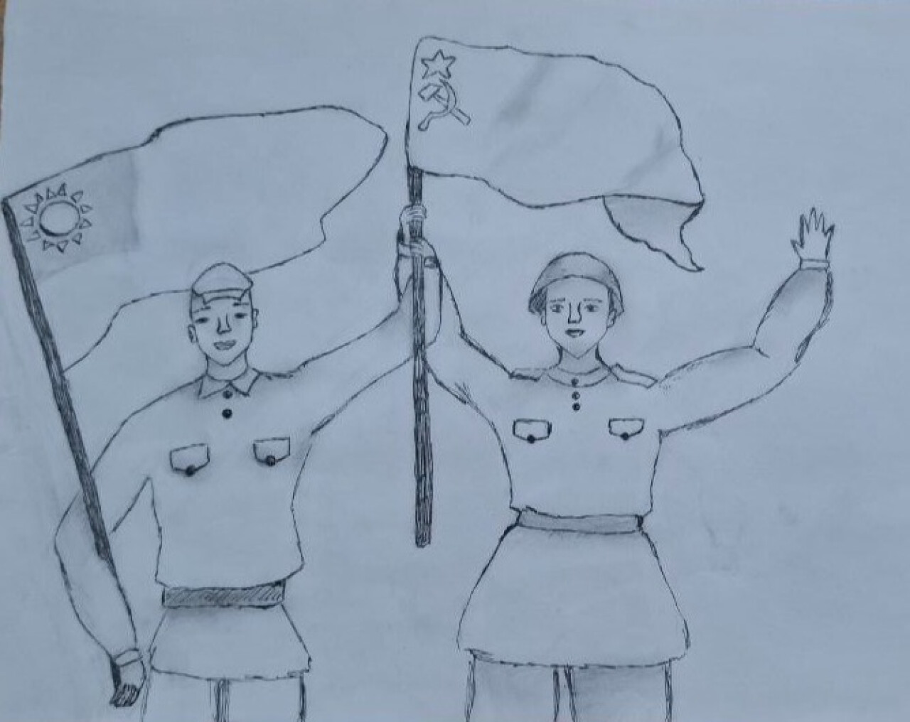 В своей работе я изобразила солдат двух государств России и Китая. Юноши одеты в обмундирование, которая была в армии 80 лет назад. Они держат в руках военные стяги того же времени. Несмотря на то, что я не использовала цвет в своём рисунке, от картина наполнена светом и радостью от Победы. Я рада дружбе наших стран!