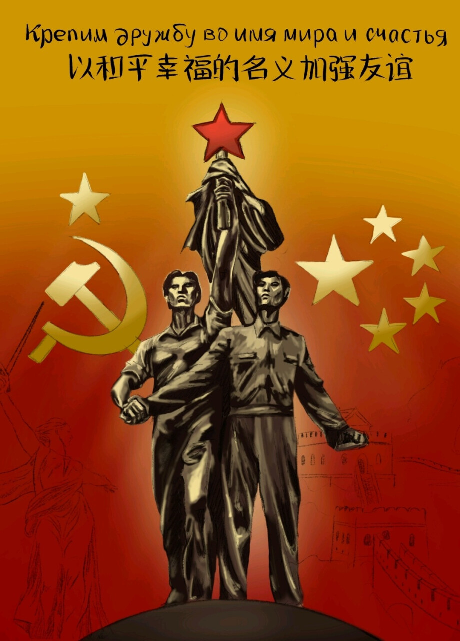 Поза героев и звезда в руках символизирует уверенность в союзе, общий путь, жертвы и готовность к совместным действиям. Крепкий фундамент под ногами символ борьбы за общее будущее. На фоне красный-цвет победы, жёлтый-величие, память и победа.
