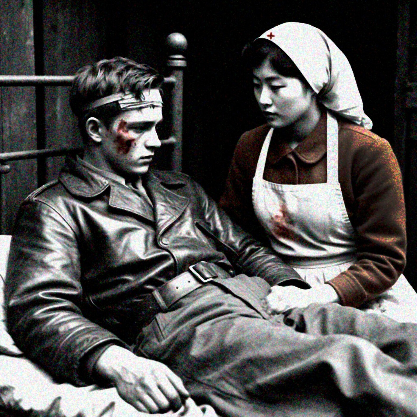 Трогательная и символичная сцена, 1939 год. Молодой раненный советский летчик в потрепанной кожаной летной куртке, лежит на металлической койке с перевязанной повязкой на голове, а рядом сидит и держит за руку китайская медсестра в шерстяном платье коричневого цвета, в белом переднике и в белой косынке с нашитым красным крестом. В лицах читается усталость, внутренние переживания, взгляды направлены в даль. Израненный летчик и заботливая медсестра сразу же переносят фокус на человеческие страдания, потери и необходимость исцеления - как физического, так и душевного. Черно -белая фотография с зернистостью, приглушенные цвета, почти монохромные с акцентом на красное, создают атмосферу подлинности, меланхолии и тяжести прошлого. Таким образом сюжет этой фотографии не просто рассказывает о войне, а о человеке на войне - о его боли, его стойкости, его способности к состраданию и поиске смысла среди разрушения.