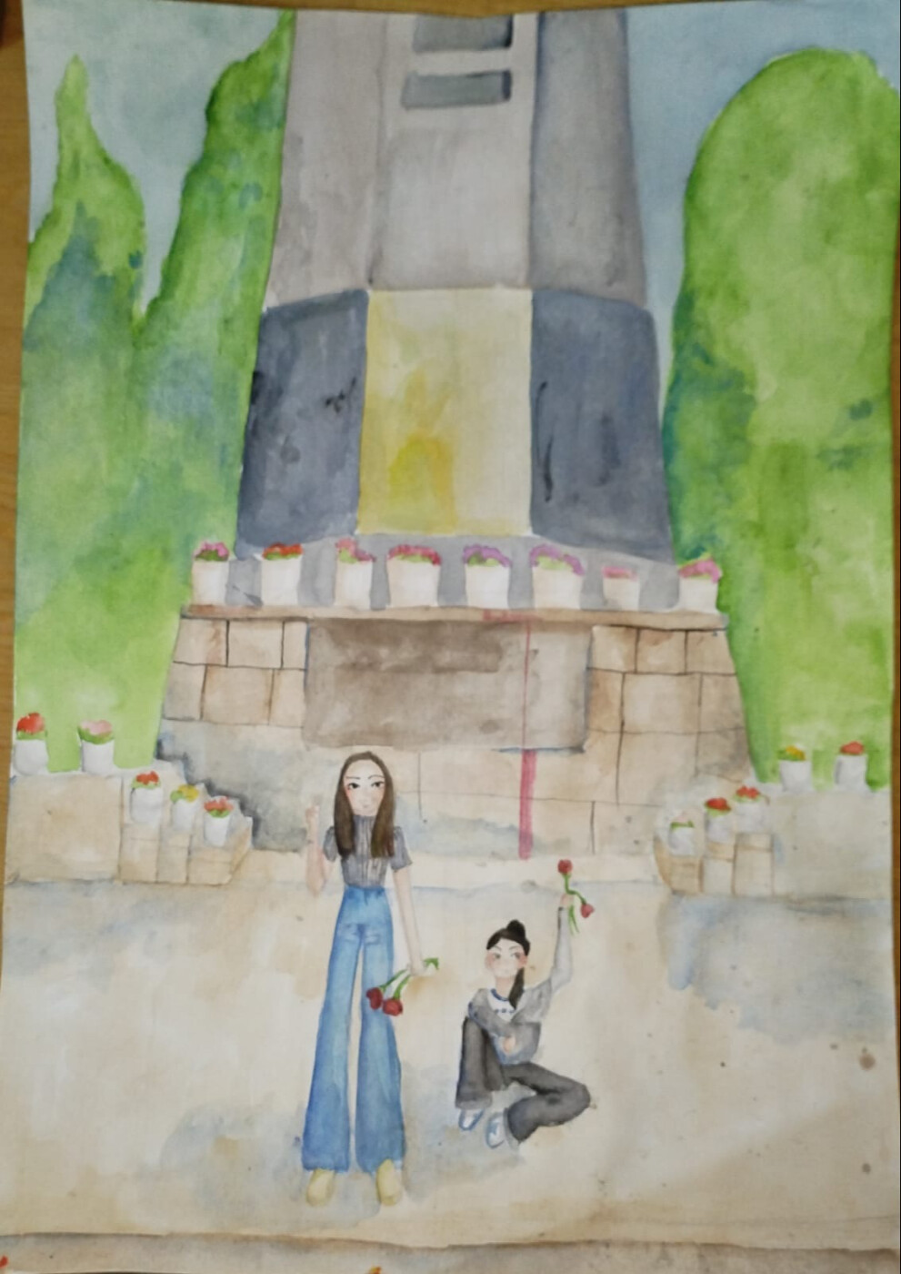 На рисунке изображены я и моя старшая сестра у братской могилы советских воинов в КНР, Автономный район Внутренняя Монголия, г. Хулун-Буир, район Хайлар, ул. Чжэнъян. В советско- японской войне принимали участие наши дяди Иванов Н.Г. и Иванов Е.Т., они освобождали город Хайлар. В этой могиле захоронены солдаты из нашего маленького района и мы хотим принести им цветы из Якутии.