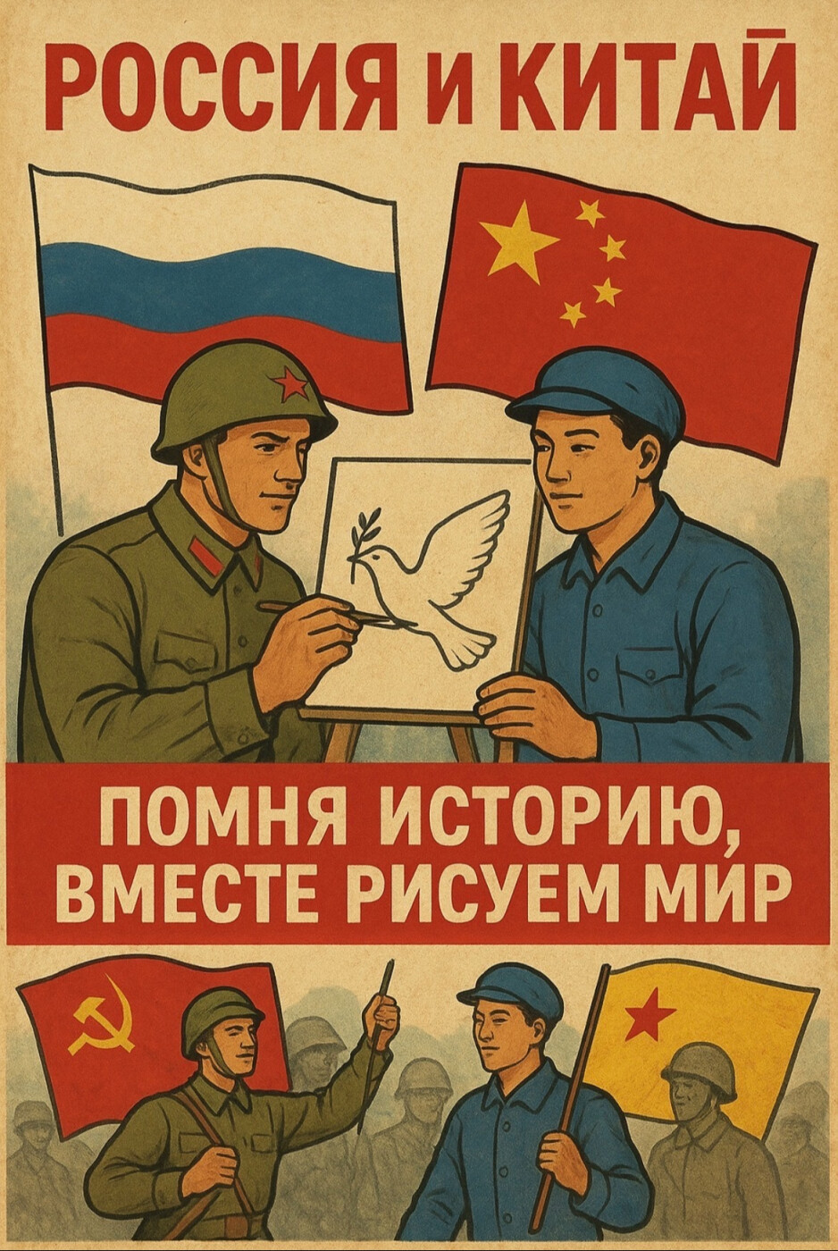 Моя работа показывает дружбу России и Китая, основанную на памяти о совместной борьбе против фашизма и милитаризма. Солдат и рабочий символизируют единство народов и общее стремление к миру. Флаги двух стран подчёркивают уважение и сотрудничество. Картина напоми-нает, что, помня историю, мы вместе создаём мир без войн. Главная идея