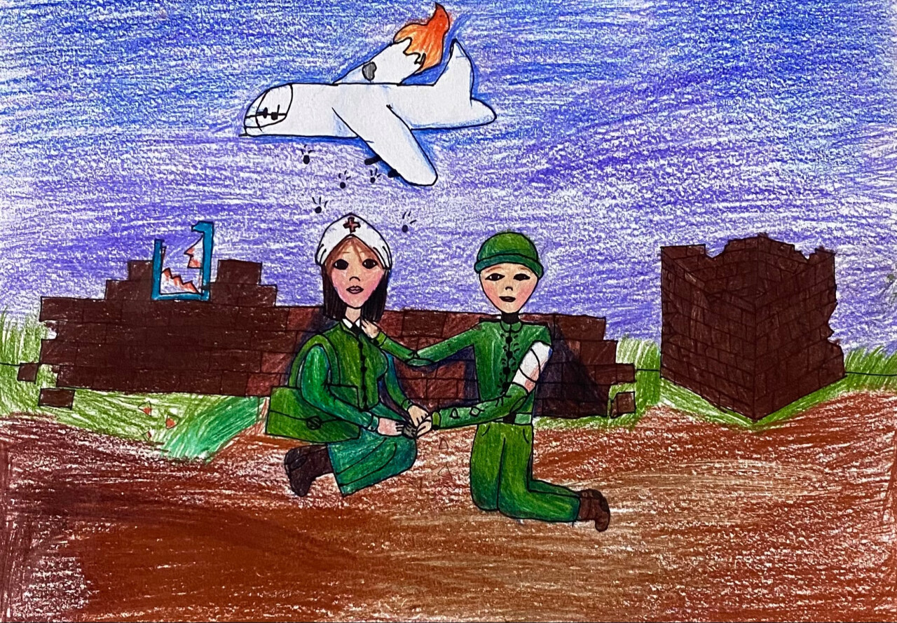 Во время войн особое место занимают врачи и медики. Я решила нарисовать рисунок, как русский полевой медик помогает на поле боя китайскому солдату.