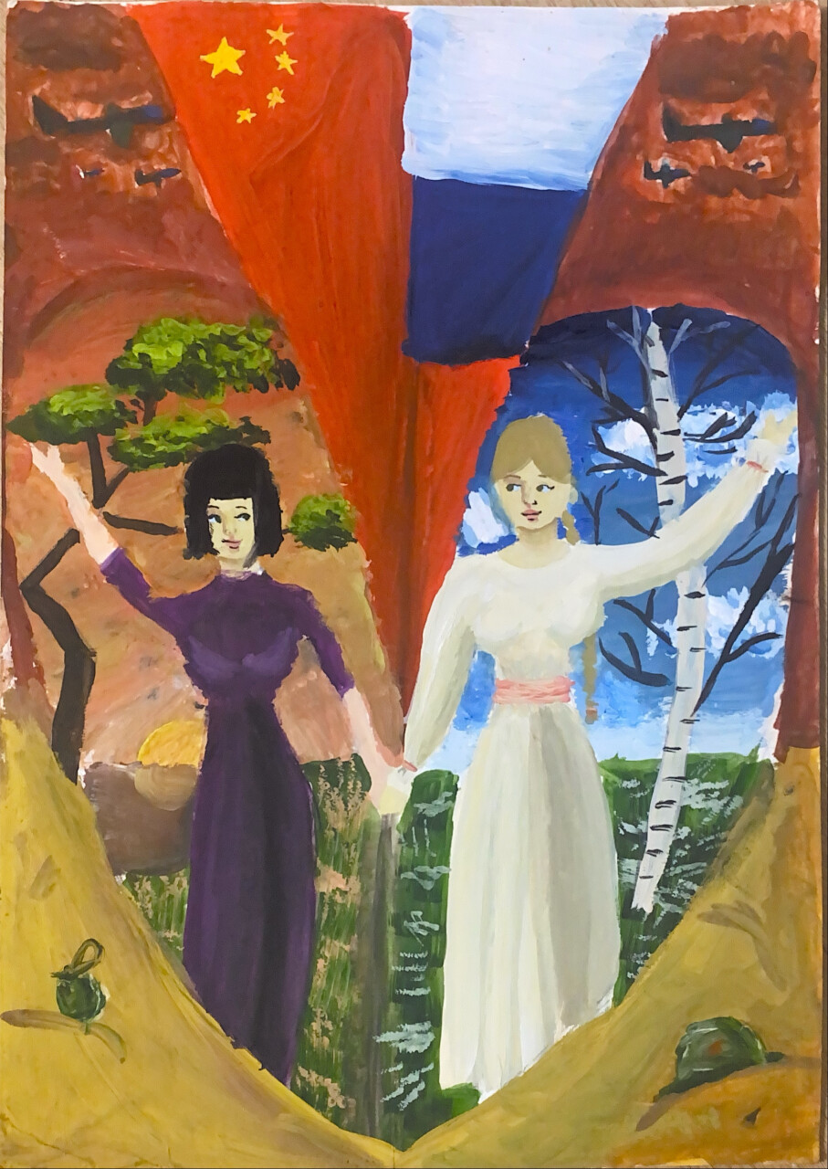 На моём рисунке символически изображено, как Россия и Китай, объединившись, побеждают зло. На фоне сердца показана Вторая мировая война, а внутри него — мир и благополучие. Также в сердце находятся две девушки — китаянка и русская. Они держатся за руки, что символизирует их сплочённость, общие интересы и цели.