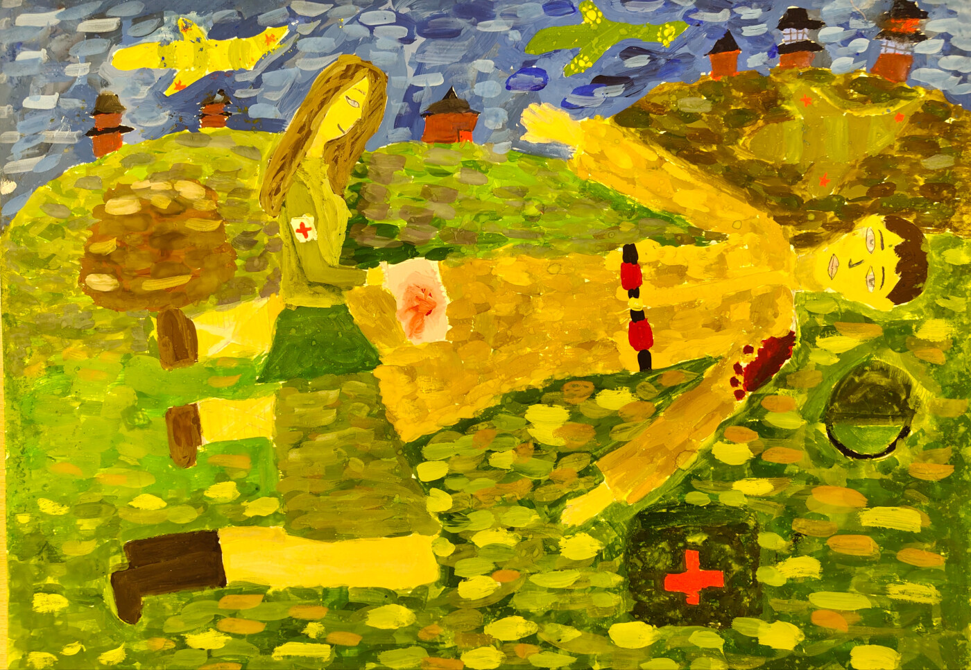 Военный защищал свой китайский город, но его ранили. Он упал и не мог пошевелится. Мимо пробегала русская медсестра с аптечкой. Она увидела раненого бойца и побежала к нему. Она достала бинт и перевязала его раненую ногу и собиралась перевязать руку.