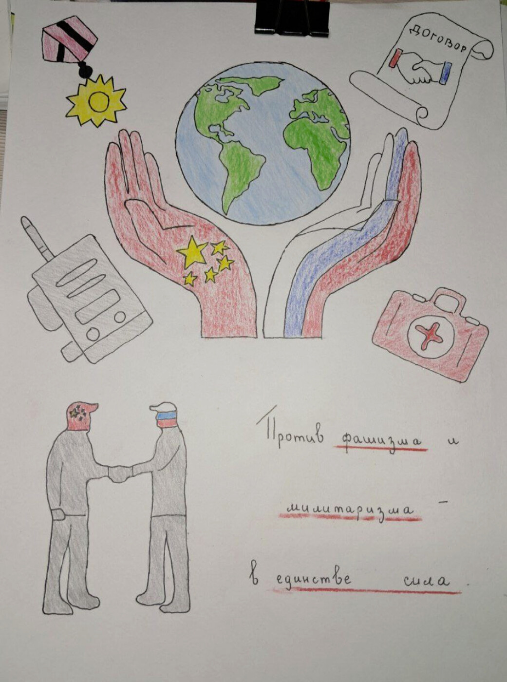 Я выбрала этот сюжет потому, что он наглядно показывает идею совместной ответственности России и Китая за сохранение мира и противостояния фашизму и милитаризму. Две большие руки удерживают земной шар, одна рука - Россия, другая - Китай. Вокруг размещены элементы сотрудничества - договор, радиосвязь, медикаменты и восстановление - что бы показать уважение и помощь друг другу.