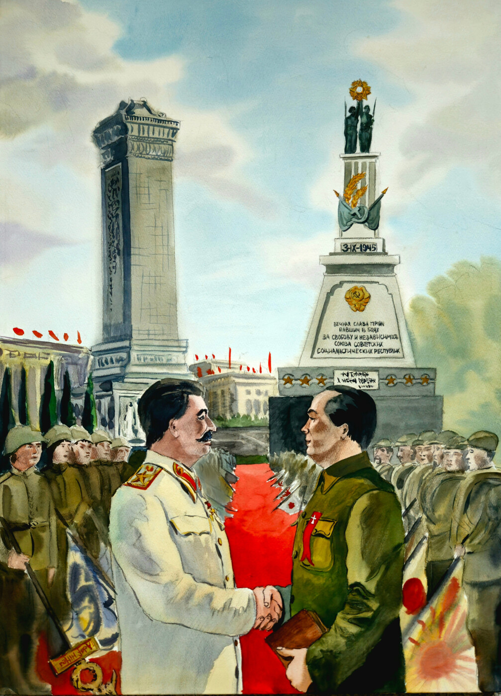 Моя работа называется «СССР и Китай – освободители мира от фашизма». Я решил не изображать какие-либо сцены войны и насилия, исходя из того, что даже название конкурса подразумевает мир(«…вместе рисуем мир»). Благодаря самоотверженным действиям и отваге граждан советского союза и китая, а так же благодаря грамотным решениям лидеров стран была достигнута победа над фашизмом во всем мире(и в Германии, и в Японии). В своей картине я показываю самый главный результат взаимодействия СССР и Китая – мирное небо. Также я хотел поведать о том, что подвиг советских и китайских солдат не должен быть забыт: память о нем хранится в мемориалах по всей территории России и Китая. Рукопожатие Сталина и Мао Цзэдуна обозначает взаимопомощь России и Китая во время второй мировой войны. А солдаты китайской народной армии и красной армии с поверженными знаменами агрессоров означают победу над немецким и японским фашизмом.