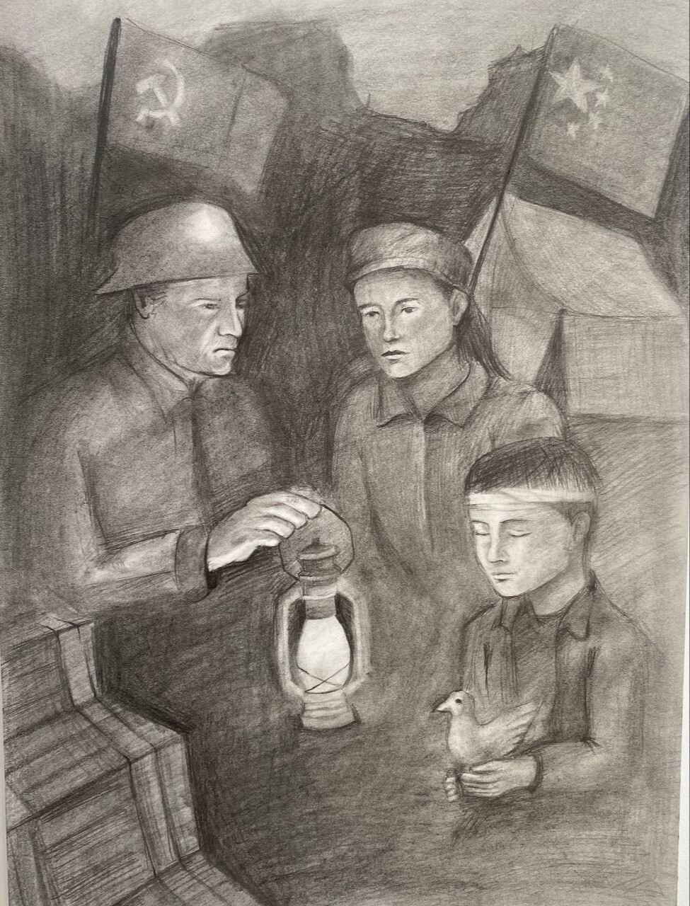 На рисунке изображены три фигуры-русский солдат и мать с сыном, собравшиеся ночью у тусклого света керосиновой лампы. Их лица сосредоточенные, спокойные, будто они осознают цену предстоящих событий. Один из них — пожилой, с каской — держит лампу, освещая остальных. Второй, молодой парень, держит в руках голубя — символ мира, хрупкого и уязвимого. Позади — два флага: советский и китайский, намекающие на братство и союз времён войны.