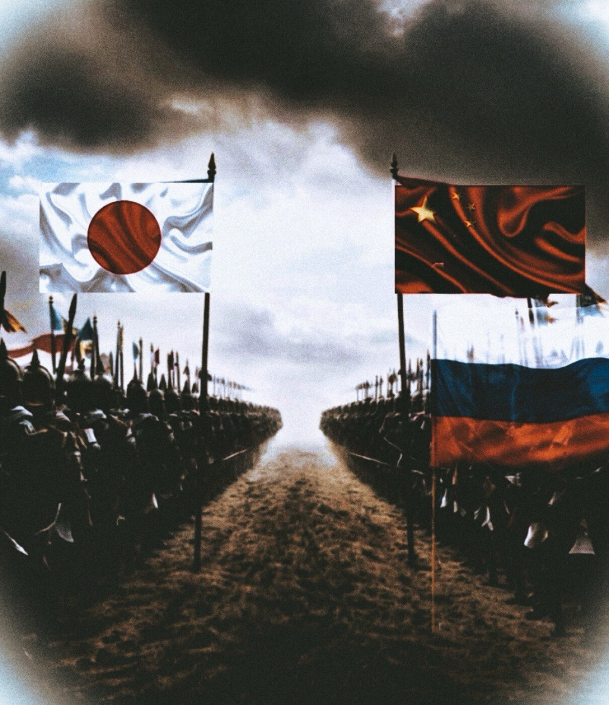 На изображении представлены две армии, стоящие друг против друга, с флагами Китая и России с одной стороны и Японии с другой. Это символизирует исторический конфликт и противостояние между этими странами. Китай и Россия объединились против Японии, во время Второй мировой войны, когда Советский Союз вступил в войну против Японии в августе 1945 года, что способствовало окончанию войны.