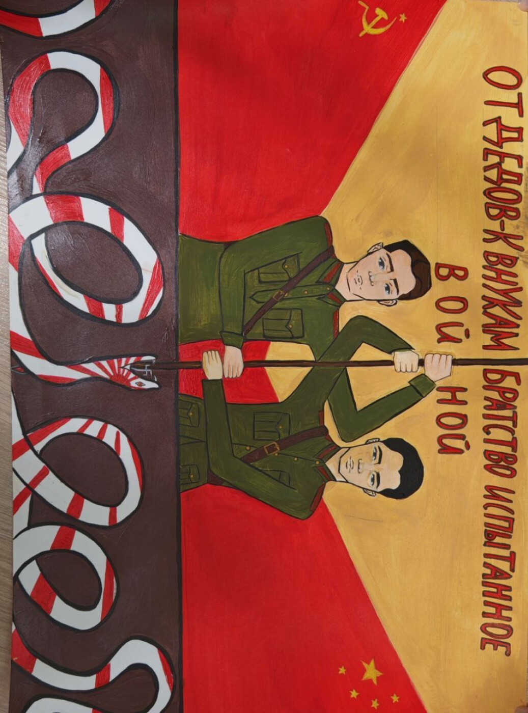 Работа "От дедов - к внукам, братство испытанное войной" выполнена в стилистике советского плаката с изображением двух солдат дружественных стран. Работа посвещена событиям общей борьбы Китая и СССР с милитаристичечкой Японией. Вдохновил на создание такой концепции работы образ Георгия Победоносца. Как и он, солдаты поражают змею копьём, которая символизирует вражескую страну и её идеологию. Окрас змеи - флаг Японии, язык - символ милитаристической идеологии, копьё - победа, которая досталась огромным трудом. Как тогда, так и сейчас союз России и Китая крепок, он заколен пламенем войны и сплочен дружбой народов.