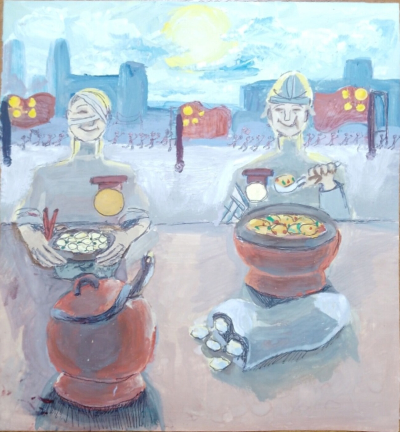 На картине изображено, как китаец и русский друг друга угощают . Один кормит вонтонами, а другой пельменями, которые его мама в дорогу успела дать