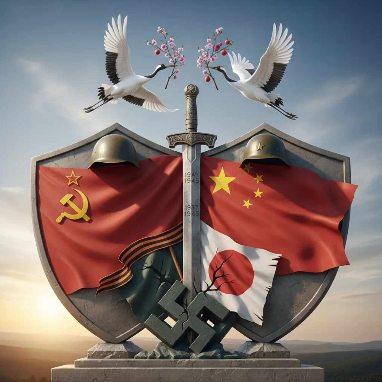 На заднем плане изображены степные просторы Синьцзяна, региона сыгравшего важную роль в поставках помощи СССР, Китаю. Именно там проходил путь снабжения Алма-Ата - Сиань, через который поставлялась львиная доля всей помощи Китаю во время Второй Мировой Войны. Между щитами, по линии их соединения, вертикально вниз опущен общий меч, который пронзает поверженные символы фашизма и милитаризма. Над щитами, в мирном небе, летит пара журавлей, которые несут в клювах цветущую ветвь — символ возрождения и мира.
