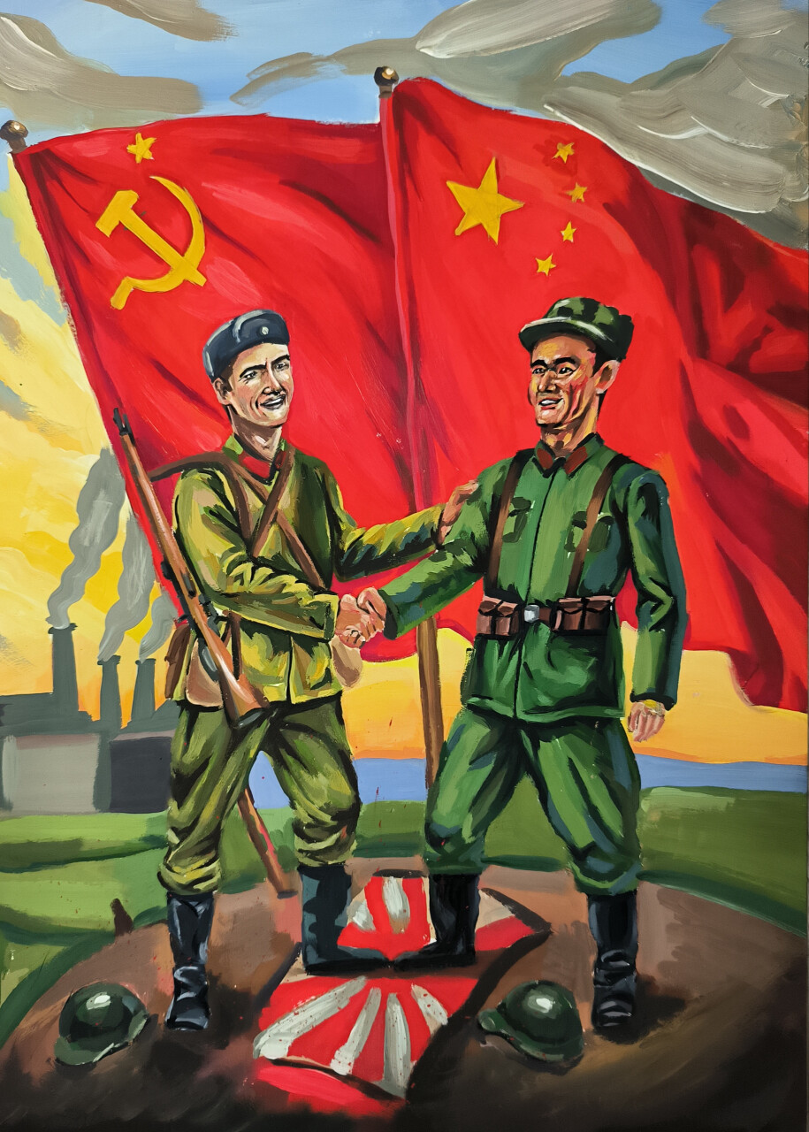 Этот яркий и живописный рисунок представляет собой символическое воплощение крепкой дружбы и сотрудничества между двумя могучими странами –Советским Союзом и Китаем, возникшей в период жестких испытаний Второй мировой войной. На рисунке изображены солдаты обеих армий, сражающихся бок о бок, подчеркивая единство и взаимовыручку народов в борьбе против общего врага. На втором плане мы видим образы разрешённых городов, символизирующих страдания и жертвы, принесенные войной. Однако яркие цвета и энергичная композиция подчеркивают дух победы и надежды на лучшее будущее, которое объединяет обе нации. Яркие, красные флаги двух государств Советского Союза и Китая расположены вместе и могущественно развиваются на ветру, вторя друг другу, выражают общую цель и стремление к победе.