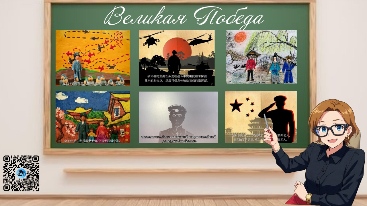 Данная работа представляет собой коллаж из кадров мультипликационных видеороликов, созданных учениками Брюсовской гимназии к 80-летию Великой Победы. Каждый видеосюжет рассказывает о подвигах китайских граждан на территории СССР в годы Великой Отечественной войны, с использованием различных техник (пластилин, песок, рисунок, графический дизайн и театр теней).