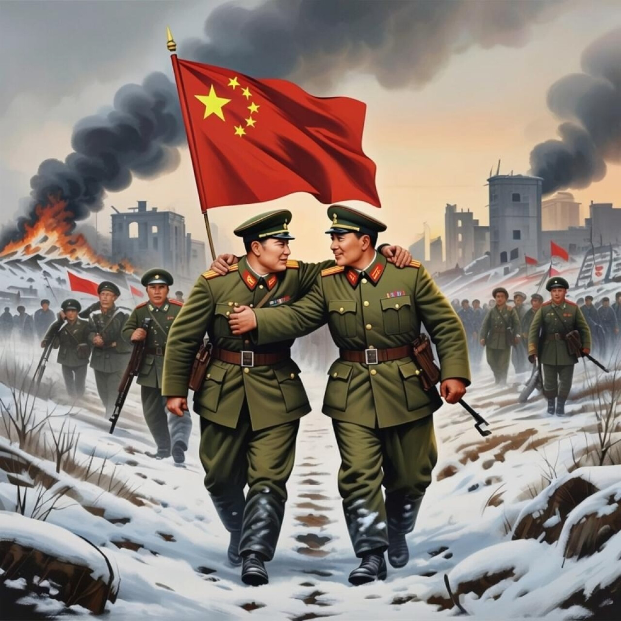 Солдаты Красной армии и китайской народной армии бок о бок сражаются против общего врага, демонстрируя международное братство и союзничество. Этот рисунок символизирует героизм и мужество обоих народов, а также показывает значимость совместных усилий в достижении победы над фашизмом. Работа выполнена в стиле современного цифрового искусства, что позволяет ярко передать эмоции и атмосферу тех исторических событий.