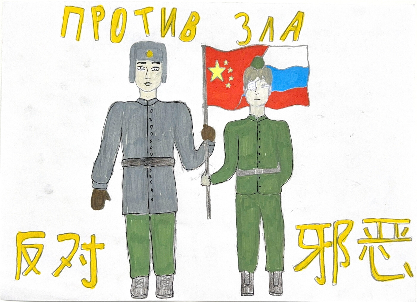 В своём рисунке я изобразил двух солдат — советского и китайского, стоящих вместе с объединённым флагом наших стран. Этот сюжет я выбрал, чтобы показать дружбу и сотрудничество России и Китая в борьбе против фашистского и милитаристского зла. Для меня важно напомнить, что именно благодаря единству и взаимопомощи наши народы смогли отстоять мир и свободу. Надпись «Против зла» и китайские иероглифы подчёркивают общую цель — противостояние насилию и защита добра. Цвета флага символизируют храбрость, мир и надежду. Моё произведение выражает уважение к подвигу тех, кто сражался, и призывает хранить память о совместной борьбе ради мира на Земле.