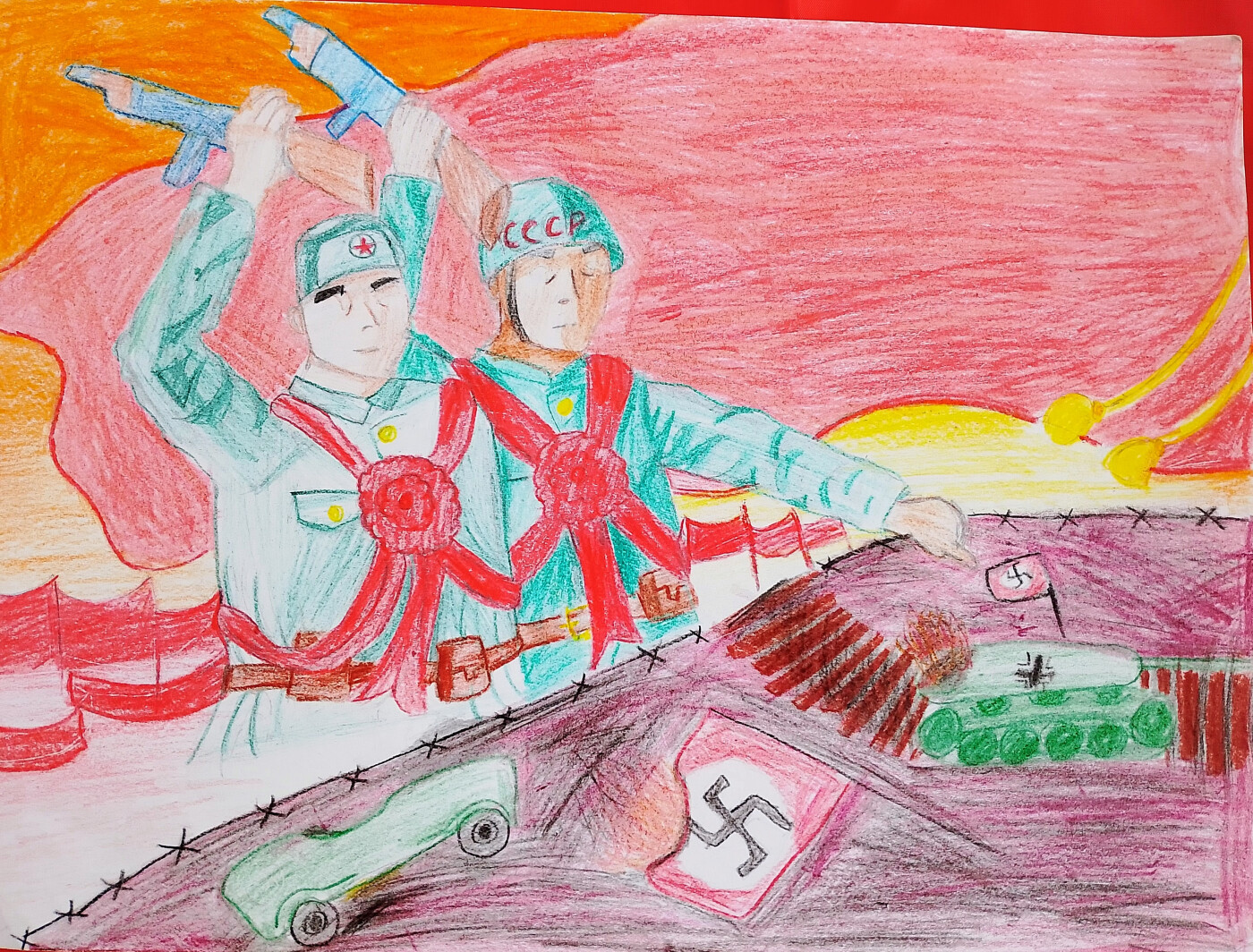 Рисунок рассказывает о совместной борьбе СССР и Китая с фашизмом во время Второй Мировой войны, благодаря которой они одержали общую победу. Идея объединения помогает нам верить в свои силы и поддерживать друг друга.