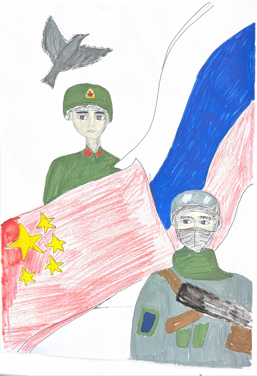 На рисунке изображены солдаты России и Китая на фоне объединённых флагов двух стран. Они символизируют дружбу, единство и совместную борьбу против зла. Летящая птица обозначает мир и надежду. Работа отражает идею взаимной поддержки и стремления сохранить мир во всём мире.