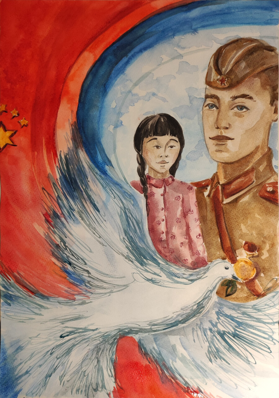 Формат А3, техника акварель, Советский солдат бережно держит маленькую девочку из Китайской Республики, как то самое важное и хрупкое. Именно девочка олицетворяет мир и светлое будущее двух стран и всего мира в общем. Ведь именно за мир, плачем к плечу, боролись деды и прадеды двух стран.