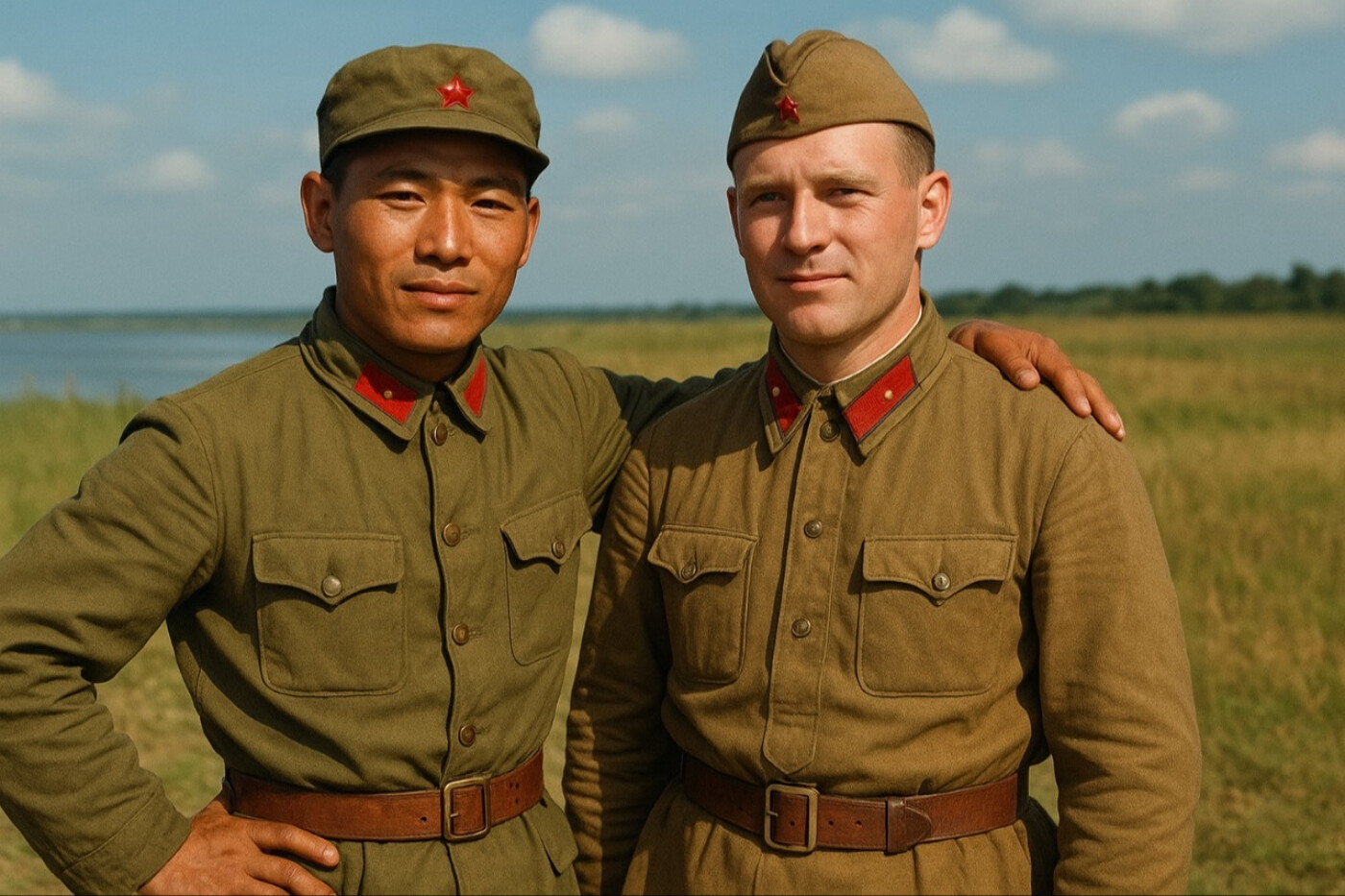 На фотографии изображены двое солдат в военной форме, стоящие плечом к плечу на фоне бескрайнего поля под чистым небом. Их уверенные взгляды и спокойные выражения лиц передают силу товарищества и чувство долга. Солдаты одеты в форму, напоминающую образ военных времён, что создаёт историческую атмосферу и вызывает ассоциации с эпохой, когда чувство единства и взаимной поддержки было жизненно важным.