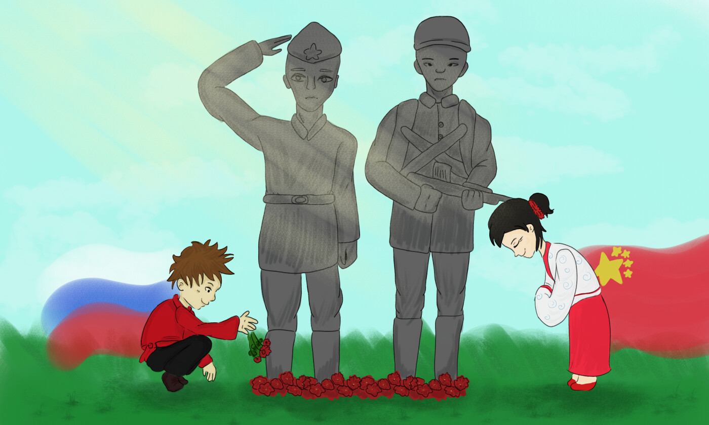 Дети двух национальностей приносят дань уважения солдатам Китая и России во времена Второй мировой войны.