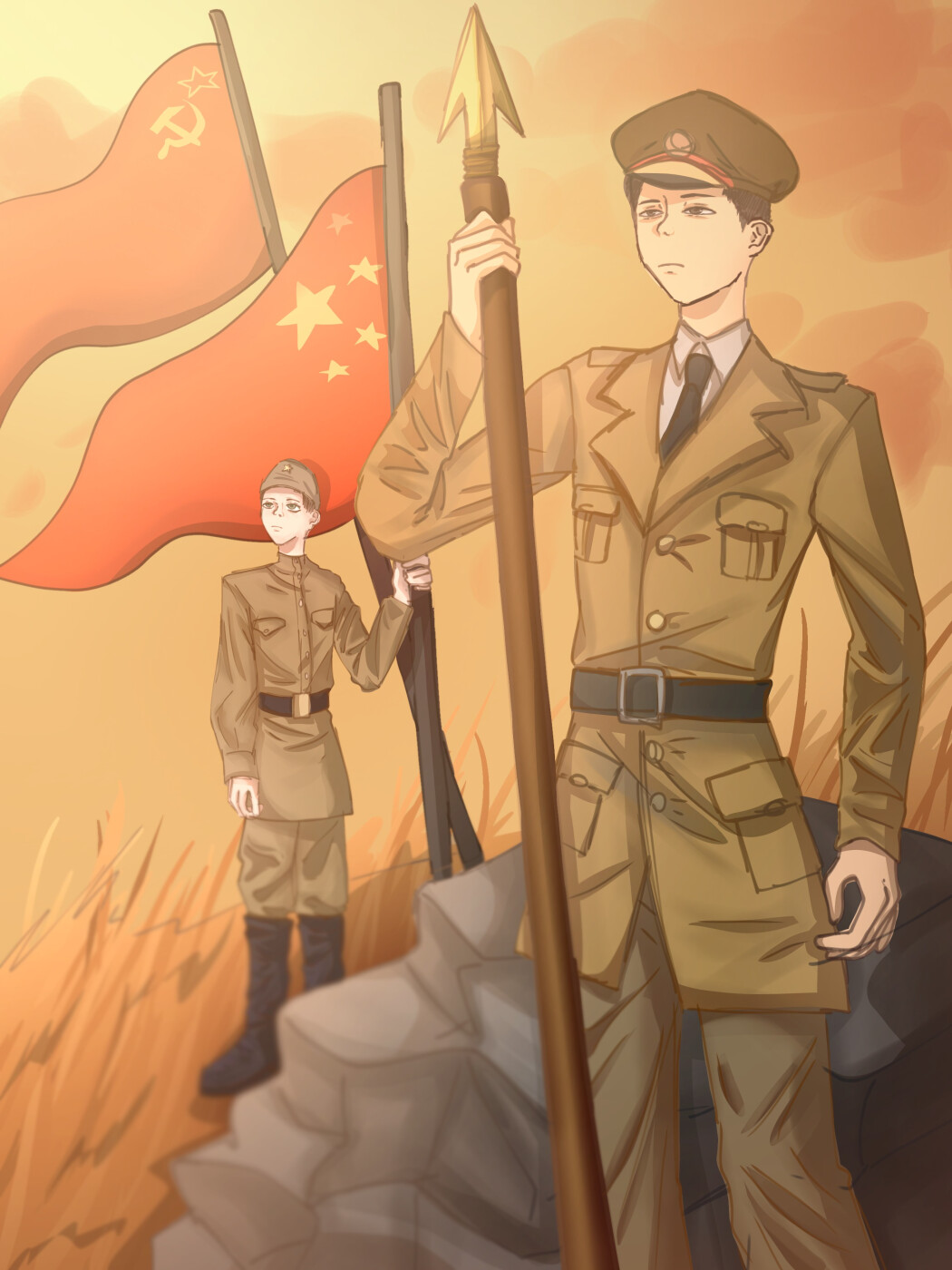На моём рисунке изображён момент братской встречи китайского и советского солдат после совместной победы над общим врагом. Выбор сюжета подчёркивает историческую правду о том, что наши народы вместе прошли через тяжелейшие испытания войны. Китайский боец, опираясь на копьё, символизирует национальное сопротивление, а советский солдат с двумя флагами — наше боевое братство. Они смотрят в одну сторону, что показывает общность наших целей и надежд. Идея работы в том, чтобы напомнить о ценности союза, принесшего мир на наши земли. Эта память вдохновляет новое поколение китайцев и россиян на совместное творение будущего, свободного от войны.