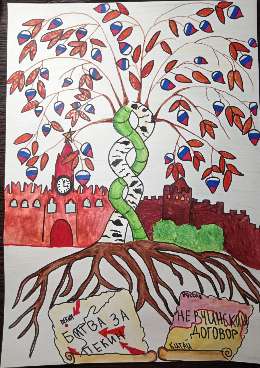 Эта картина отражает дружбу стран. дружбу отражает дерево, ствол которого сплетен из Российской березы и китайского бамбука, также листья на которых изображены флаги дружественных стран. А корни показывают, что ещё из древности зараждалась дружба стран.
