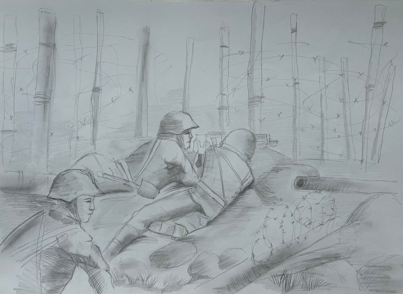 Мой рисунок отражает фрагмент оборонительной операции китайских солдат в годы Второй Мировой Войны. Китайскому государству активно оказывало помощь Советское правительство, снабжая их техникой, оружием и обучением солдат.