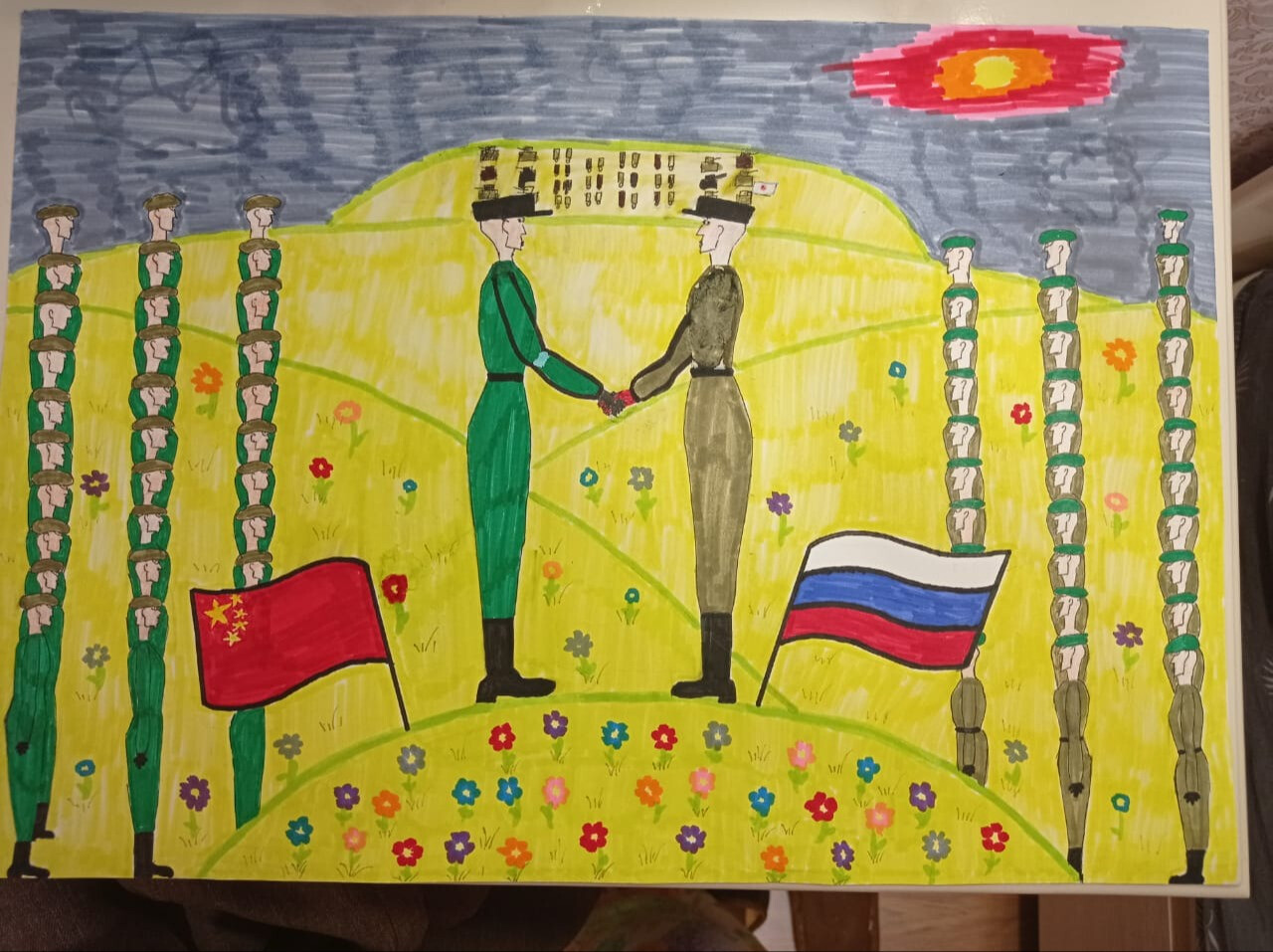 На рисунке я изобразила как Россия и Китай вместе боролись с японскими милитаристами в годы Второй мировой войны. С правой стороны листа нарисована русская армия , а слева китайская армия.Идея рисунка заключается в демонстрации единства и сотрудничества между Россией и Китаем в борьбе против японских милитаристов во время Второй мировой войны. Совместные усилия двух стран, несмотря на различия культур. Этим рисунком я хотела донести важность взаимопомощи за мир и свободу.