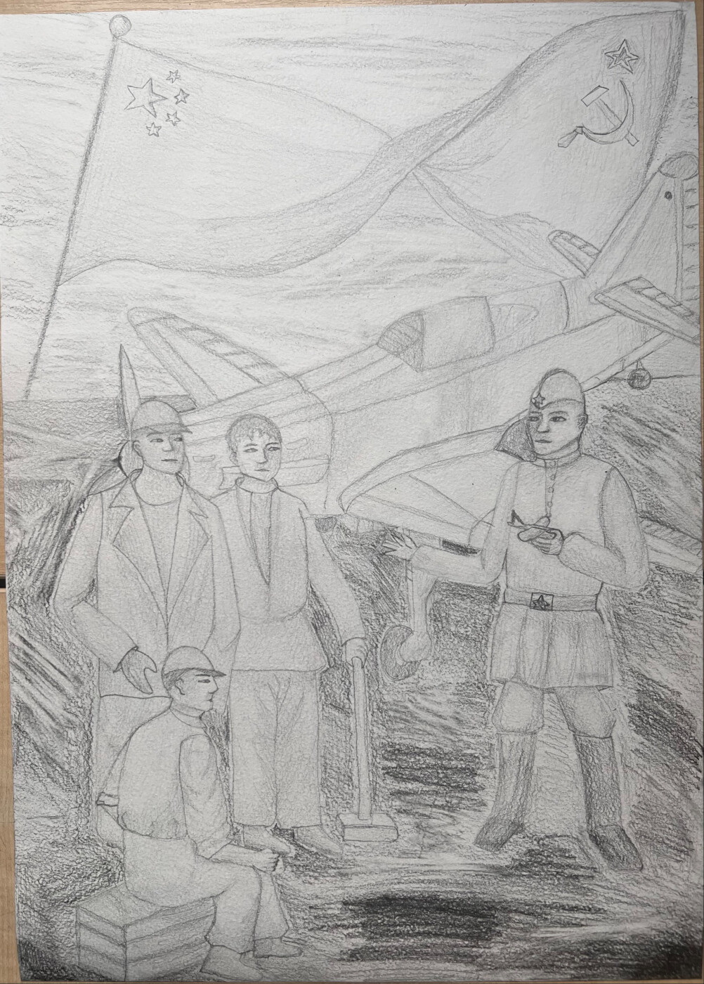 Свою работу я посвящаю памяти моего прадедушки, Кузнецова Федора Николаевича, техника боевых самолетов-бомбардировщиков. Он воевал в русско-японской войне, до 1952 года проводил подготовку и обучение техников для военной авиации Китая. Благодаря сопротивлению китайского народа японским захватчикам, благодаря братской помощи русского народа, немецкий и японский фашизм был уничтожен. Мы будем хранить в памяти имена Героев, подаривших ценой своей жизни мир будущим поколениям. Это наша общая Великая Победа!