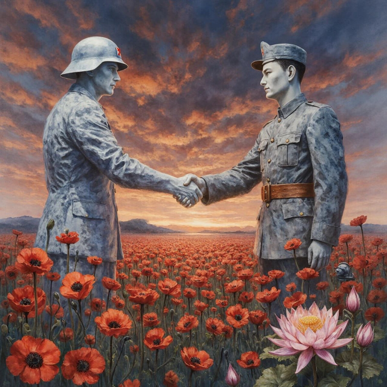 На картине — русский и китайский солдаты, встречающиеся уже не как враги или союзники, а как души, пережившие всё и сохранившие достоинство. Они пожимают руки на поле, где маки и лотосы растут из земли, напитанной памятью.