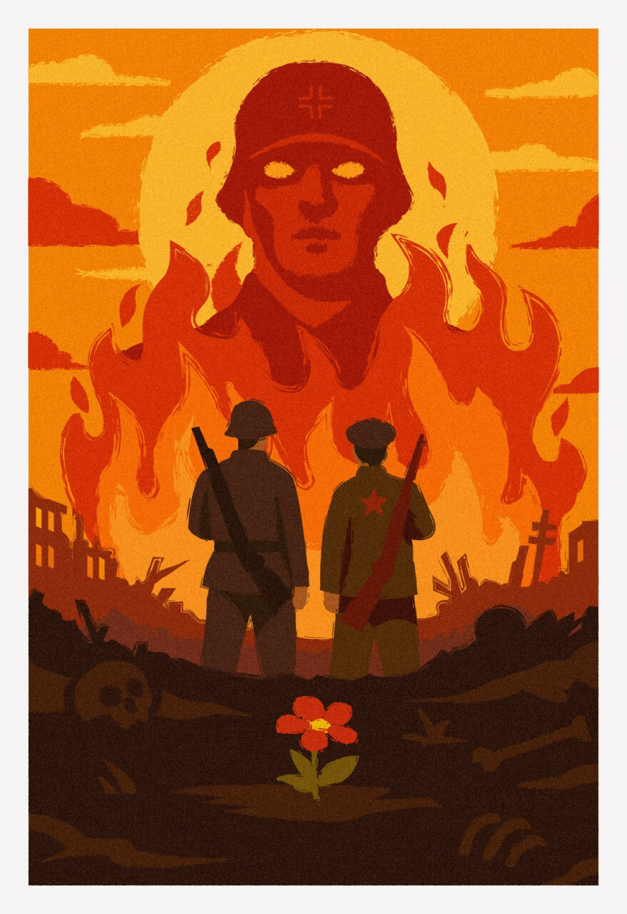 Солдаты символизируют содружество России и Китая во Второй мировой войне. На заднем плане пылает фигура солдата в нацистской каске, которая символизирует фашистскую Германию. Разрушенный город и могилы на фоне подчеркивают трагизм и разрушения войны. В центре композиции цветок - символ надежды.