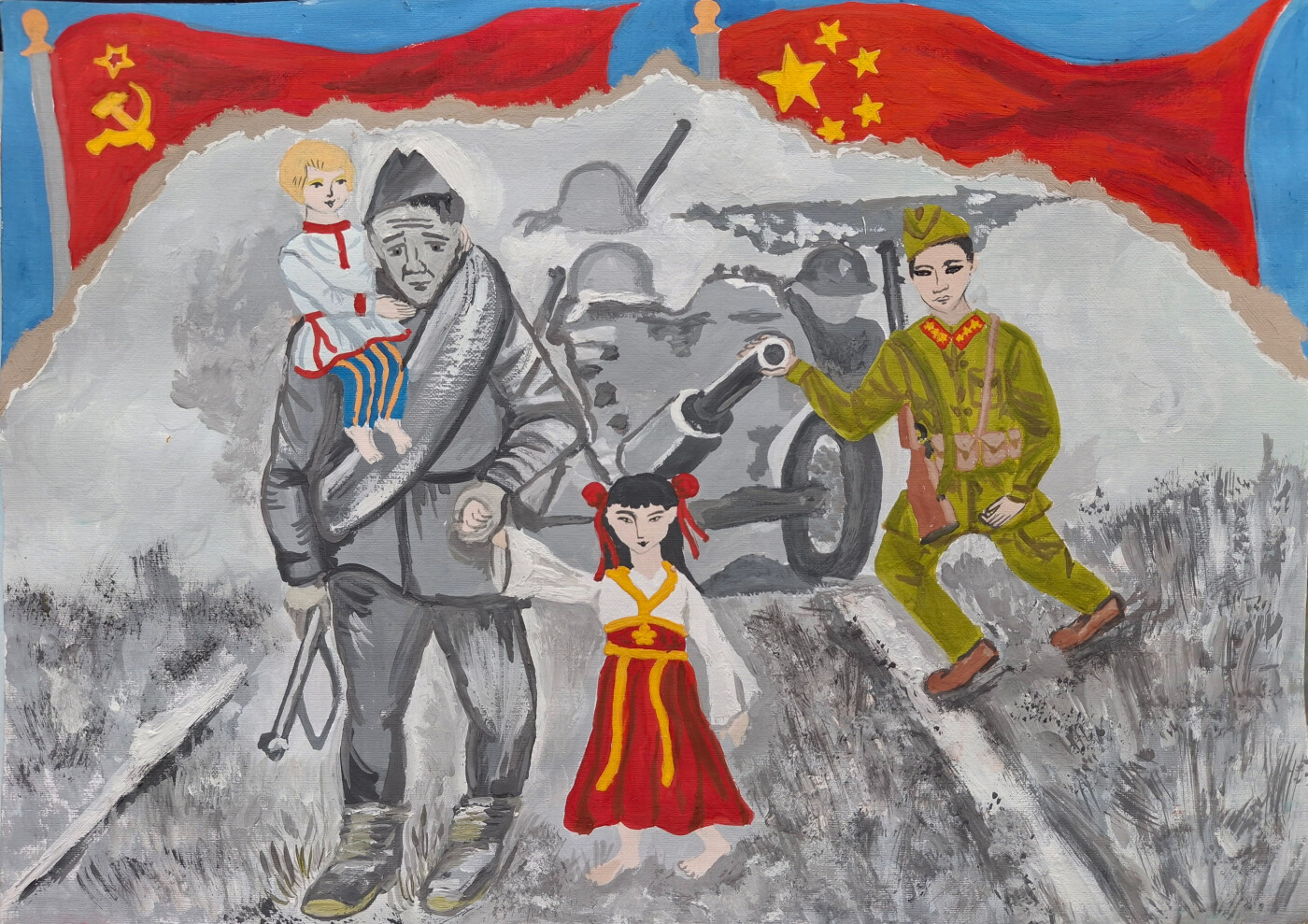 Я долго думала, что нарисовать, а потом увидела фотографию Израиля Озерского "Солдат войны", - и у меня в голове возникла картина! Солдаты двух стран - Советского Союза и Китая защищают жизнь детей. Детей я изобразила в национальных костюмах - русском и китайском. Этим я хотела показать единство , помощь и дружбу двух великих стран, и то, что чужих детей не бывает, все дети - родные! И как важна взаимная помощь народов , чтобы победить в войне.