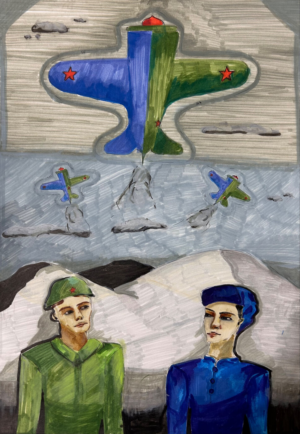 В своей работе я хотела показать самолеты, что сражались до последнего и защищали с высоты птичьего полета. Советских солдат, что всеми силами помогали друзьям из Китая. Их дружбу и понимание друг друга в тяжелое, серое время. А также желание и возможность делить все поровну.