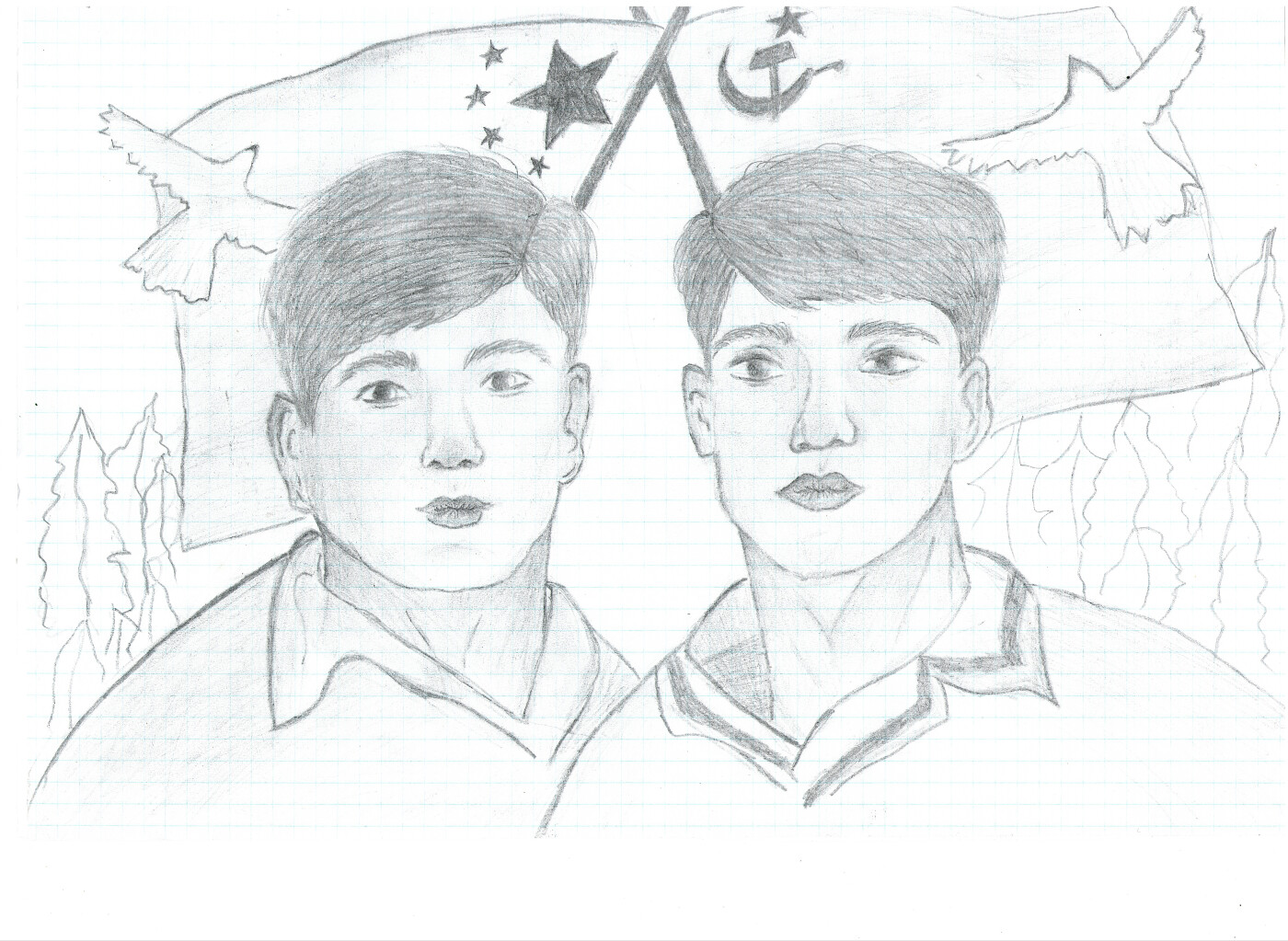 На моей картине изображены два солдата-русский и китаец, символизирующие единство и общие цели двух наций. Их взгляды наполнены уверенностью в мирное будущее. Эта работа служит напоминанием о былом, о совместных военных действиях и победе над врагом. Их дружба и солидарность олицетворяют идеал мира и братство между народами. Только вместе мы смогли преодолеть самые серьёзные испытания, выпавшие на долю русского и китайского народов-такова финальная нота моей работы.