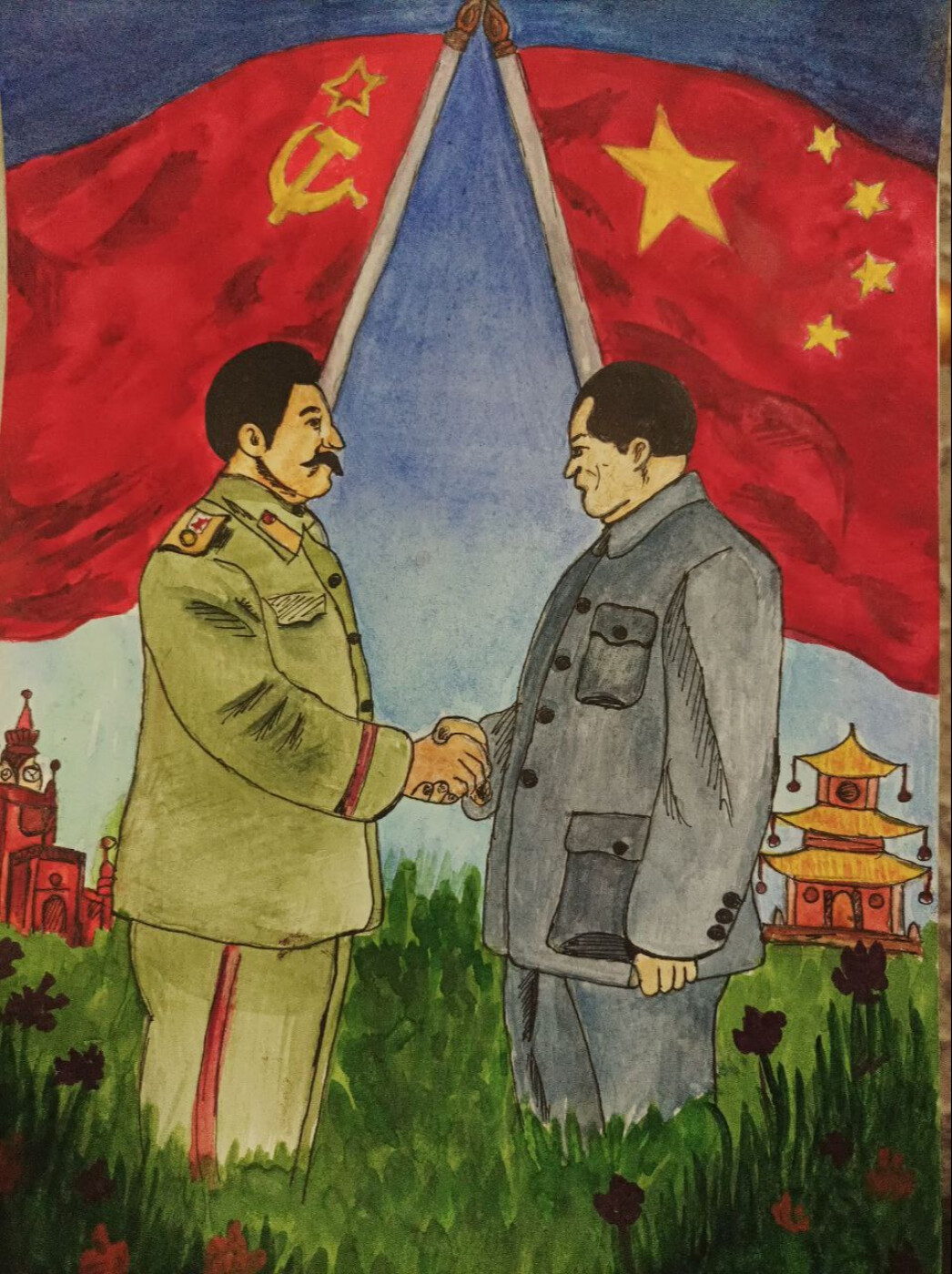 На рисунке изображен символический момент дружбы и союза между СССР и Китаем в годы Второй мировой войны. Композиция, объединяющая рукопожатие лидеров, национальные флаги и узнаваемую архитектуру двух столиц, олицетворяет общую память о жертвах и совместной борьбе за свободу. Это визуальное напоминание о том, как важно хранить мир, помня уроки истории.
