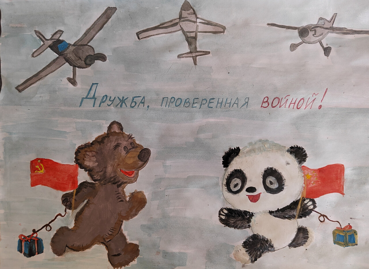 Название рисунка: "Дружба, проверенная войной" подчёркивает особую прочность и искренность дружеских связей, сформировавшихся в условиях тяжёлых испытаний и опасностей. Именно так и можно сказать о сотрудничестве двух стран России (СССР) и Китая в годы Второй мировой войны. Бурый медведь (неофициальный символ России) и большая панда (бамбуковый медведь) (неофициальный символ Китая) бегут на встречу друг другу с флагами своих стран и помощью, в виде подарков. А в небе самолёты и война...