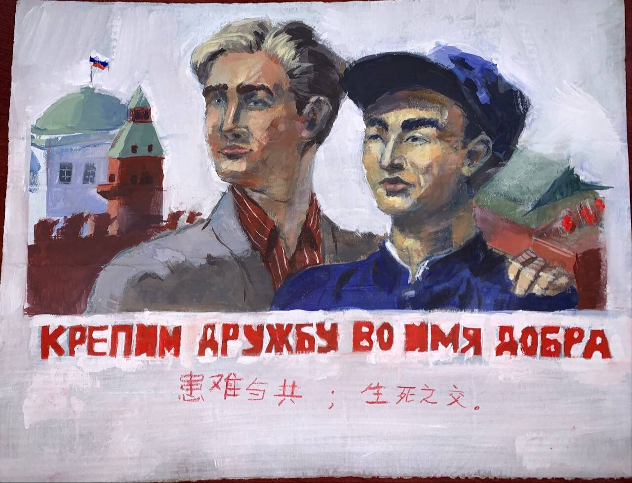 На картине изображены два человека. Представители Российского и Китайского народа, которые объединяются единой идеей мира и дружбы. На фоне виднеются знаковые достопримечательности — Великая Китайская стена и Кремль, подчеркивающие историческую связь и взаимное уважение.Светлое небо над ними олицетворяет надежду на будущее, где дружба и сотрудничество станут основой для совместного процветания. Эта работа призывает зрителей задуматься о важности взаимопонимания и единства в мире, где каждая культура вносит свой уникальный вклад в общее благо.