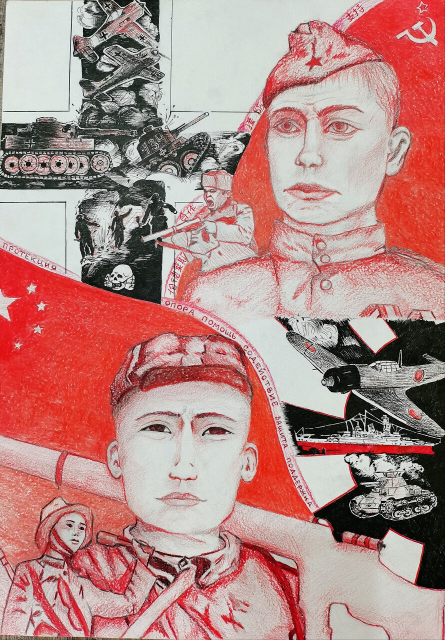 В своей работе "Дружба, закаленная войной" я хотела показать два противостоящих друг другу мира: красный - две дружественные державы, СССР и Китайская Республика, и чёрный - вероломные и агрессивные захватчики, Нацистская Германия и Японская империя.