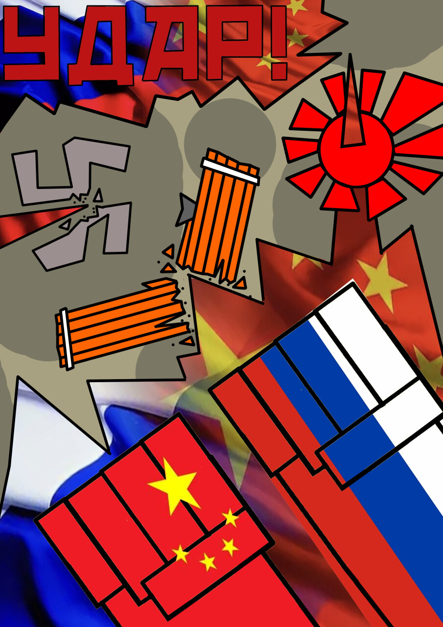 Для создания этого произведения был выбран сюжет, отражающий идею единства и боевого сотрудничества между Россией и Китаем в противостоянии фашистским и милитаристским режимам. Главными символами плаката стали стилизованные кулаки, окрашенные в цвета национальных флагов, которые наносят мощный удар по изображениям свастики, фашистских колонн и имперского японского восходящего солнца. Такой выбор сюжета обусловлен исторической памятью о совместной борьбе двух стран против захватчиков и насильственных идеологий в XX веке.