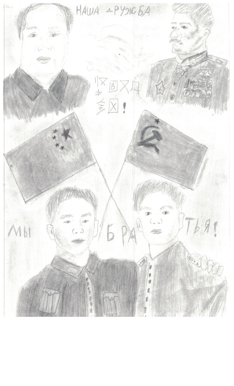 В своём рисунке я хотела отразить то, что дружба и сотрудничество между странами организуется главами государств, но её основой становится простой народ. Так и в 40-х годах объединение СССР и Китая против фашизма Германии и милитаризма Японии было организована вождями этих стран, но именно простые солдаты сделали это сотрудничество успешным.