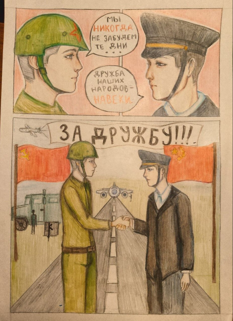 Этот комикс отражает ключевые моменты сотрудничества СССР и Китая в борьбе с милитаризмом. Через образы солдат показаны единство и взаимопомощь двух народов. Использованы символы обеих стран: Великая Китайская стена, флаги, военная форма. Особое внимание уделено диалогам, подчёркивающим духовную связь между воинами. Комикс демонстрирует, как совместные усилия привели к победе над общим врагом, а дружба народов стала крепче в испытаниях войны.