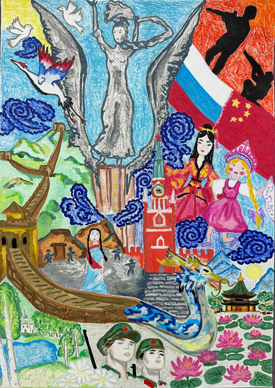 В нижней части композиции - окончание Второй мировой войны. Плечом к плечу русский и китайский солдат, как символ общего усилия наших стран для сохранения мира по сей день. Если присмотреться к деталям рисунка, то можно увидеть разность культур и природы двух стран, но при этом символически прослеживается идея сотрудничества и дружбы наших народов.