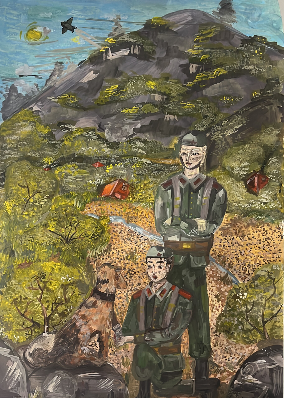 Мой рисунок о памяти о подвиге советских и китайских воинов, сражавшихся бок о бок, о доброте солдатов, которые в эти сложные моменты питались помочь верных четвероногих друзей, тоже. Дружба и верность между китайскими воинами и советскими остаётся живой вечно.