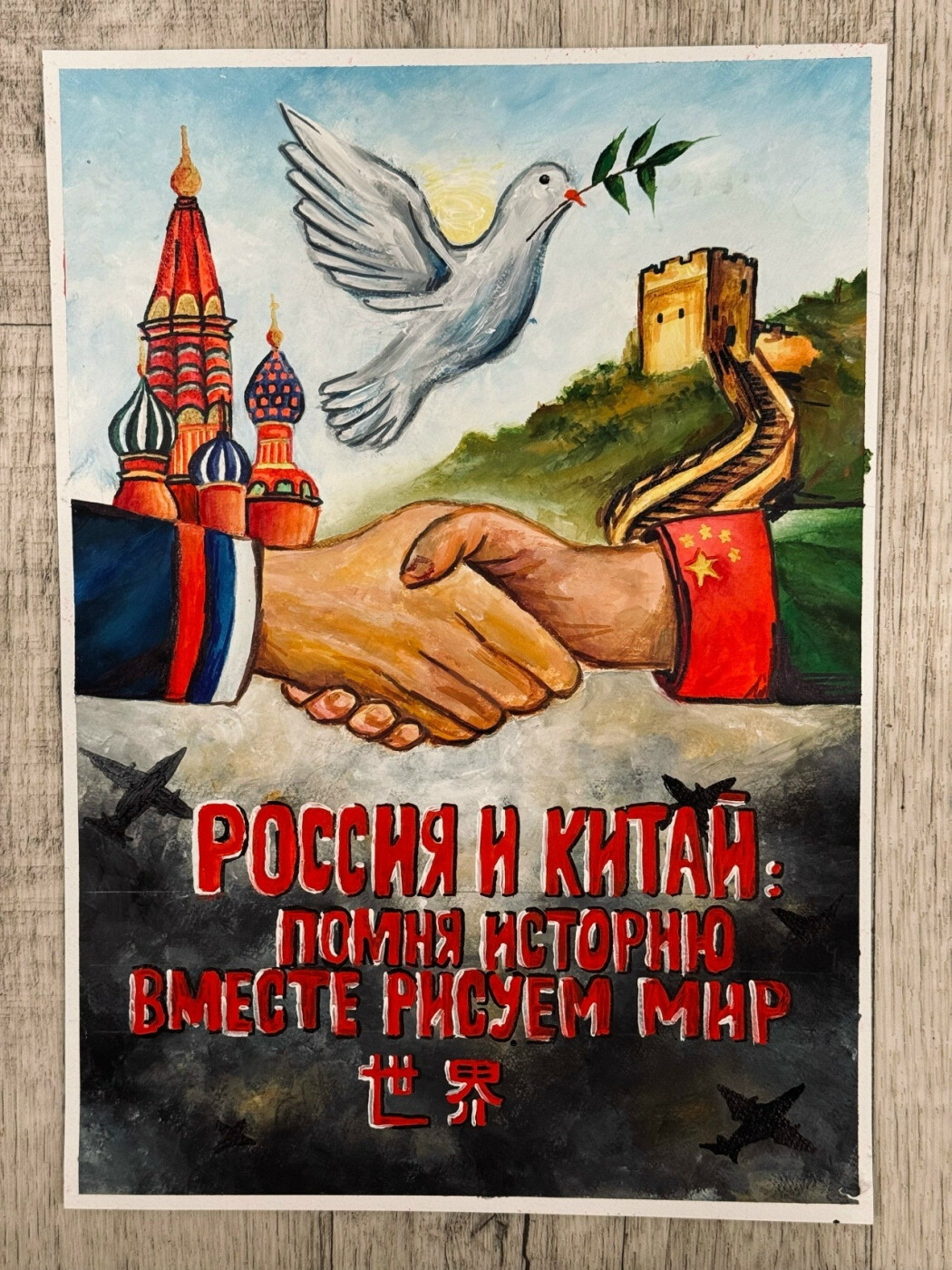 Рисунок отражает крепкую дружбу между Россией и Китаем. Архитектурные символы двух стран объединены рукопожатием, а голубь мира в центре композиции означает их совместную приверженность мирному развитию. Это визуальная метафора партнёрства, основанного на исторической памяти и едином стремлении к миру.