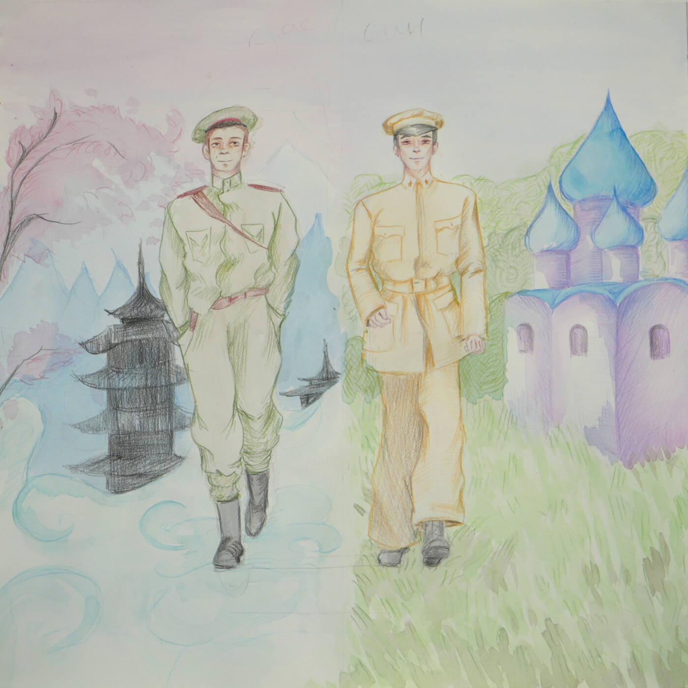 На полотне запечатлены воины СССР и КНДР, шагающие плечо к плечу в едином строю. На заднем плане, как символы их великих держав, величаво возвышаются главные достопримечательности обеих стран. Основным смыслом работы является идея нерушимой дружбы: сколь бы далёкими ни были родные земли, сердца людей, объединённых общей целью, бьются в унисон, а их дух непоколебим.