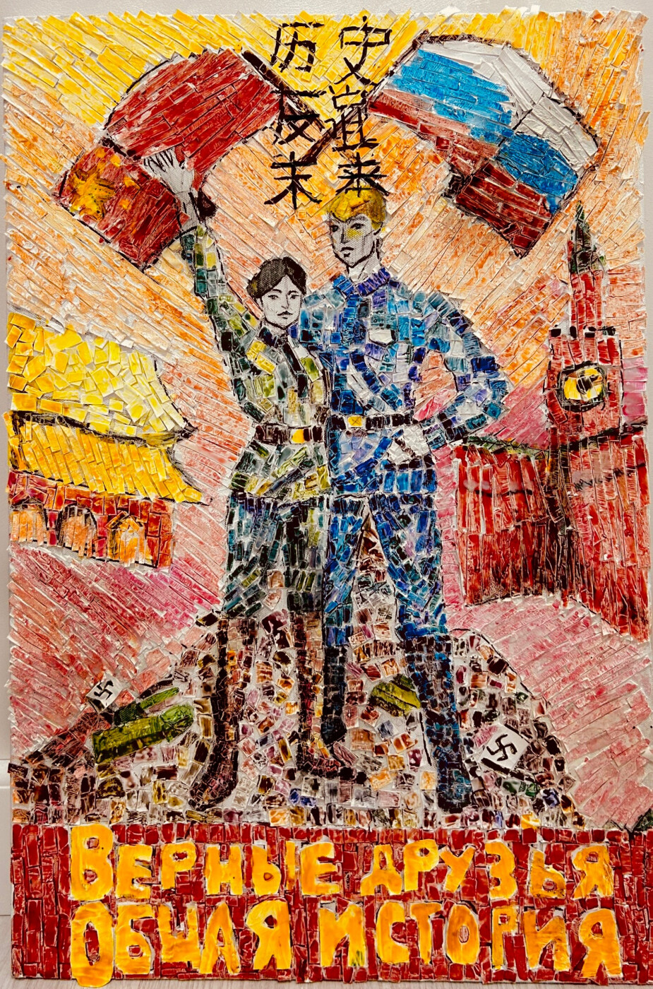 Эта картина запечатлела общий подвиг Китая и России в борьбе с фашизмом. Русский солдат и китайская женщина-воин, стоящие рядом, символизируют крепкий союз, рождённый в войне. Их судьбы – связь между прошлым и будущим, от трудных времён к надежде на мир и добро. Композиция картины ведёт взгляд зрителя вперёд, показывая общее стремление двух народов к светлому будущему. Флаги победы и восстанавливаемые города напоминают о цене мира. Эта картина – не просто память о героизме, а исторический урок о силе союза, основанного на справедливости и уважении.